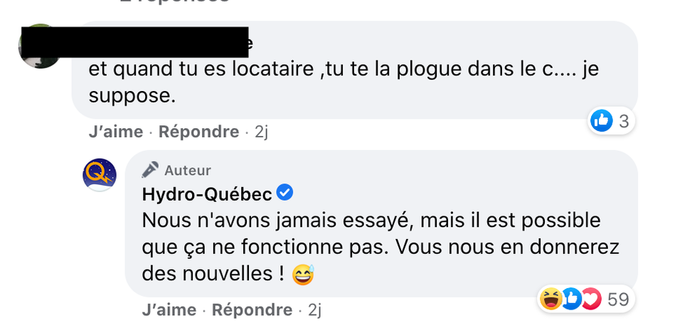 « Nous n'avons jamais essayé, mais il est possible que ça ne fonctionne pas. Vous nous en donnerez des nouvelles », a écrit le ou la gestionnaire des réseaux sociaux d'Hydro-Québec.