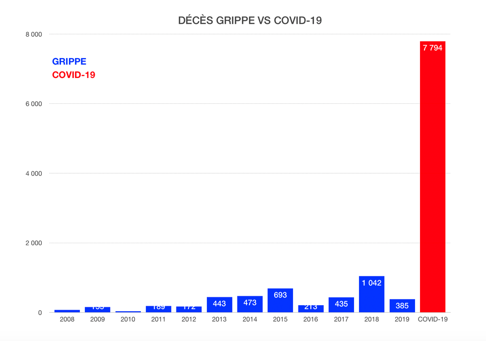 Le diagramme ci-dessus, créé avec les données à jour de ce mardi 22 décembre et aussi illustré par le journaliste Patrick Déry, montre à quel point le virus a causé plus de décès que la grippe dans les douze dernières années.