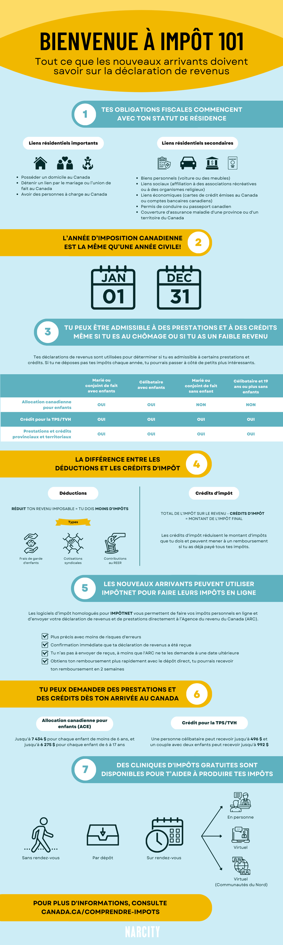 Le Programme communautaire des bénévoles en matière d’impôt (PCBMI) de l'ARC est parfait pour les nouvelles.aux arrivant.es au Canada, et j'aurais aimé connaître cette ressource plus tôt. Au Québec, il s'agit du Service d'aide en impôt – Programme des bénévoles.
