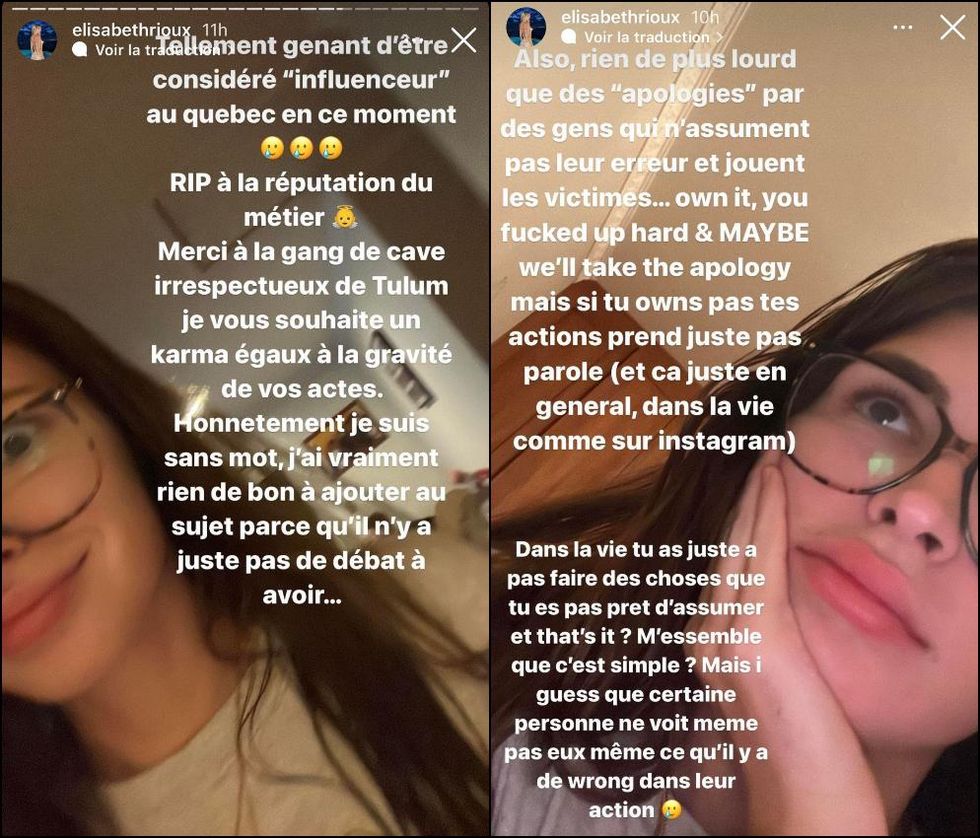 « Tellement gênant d'être considéré "influenceur" au Québec en ce moment. RIP à la réputation du métier. Merci à la gang de c**es irrespectueux de Tulum. Je vous souhaite un karma égal à la gravité de vos actes. Honnêtement je suis sans mot, j'ai vraiment rien de bon à ajouter au sujet parce qu'il n'y a juste pas de débat à avoir... »