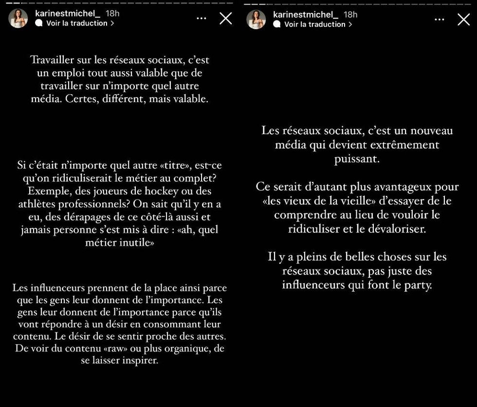Dans une série de stories écrites, Karine d'OD Bali a qualifié l'image du métier d'influenceur.se qui est véhiculée dans la sphère publique comme étant frustrante :