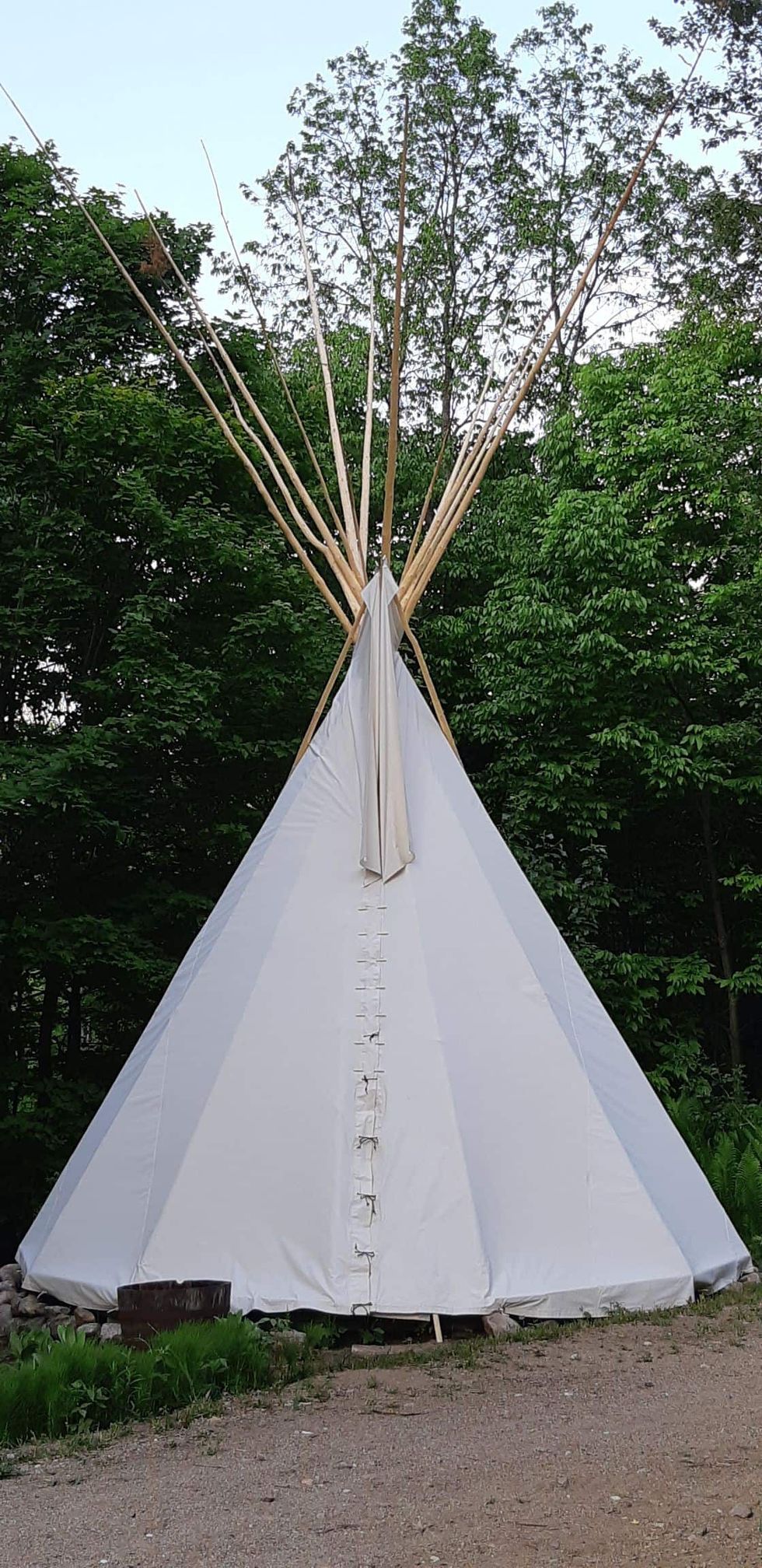 Pourquoi tu dois booker : Disponible pour deux personnes, le tipi au soleil levant vous propose un séjour en camping de luxe. Foyer intérieur et extérieur, deux petits lits au sol, une table, deux chaises, un BBQ à briquettes, des sentiers en forêt, une douche artisanale extérieure, un resto take out à proximité et de la massothérapie, sont à votre disposition.