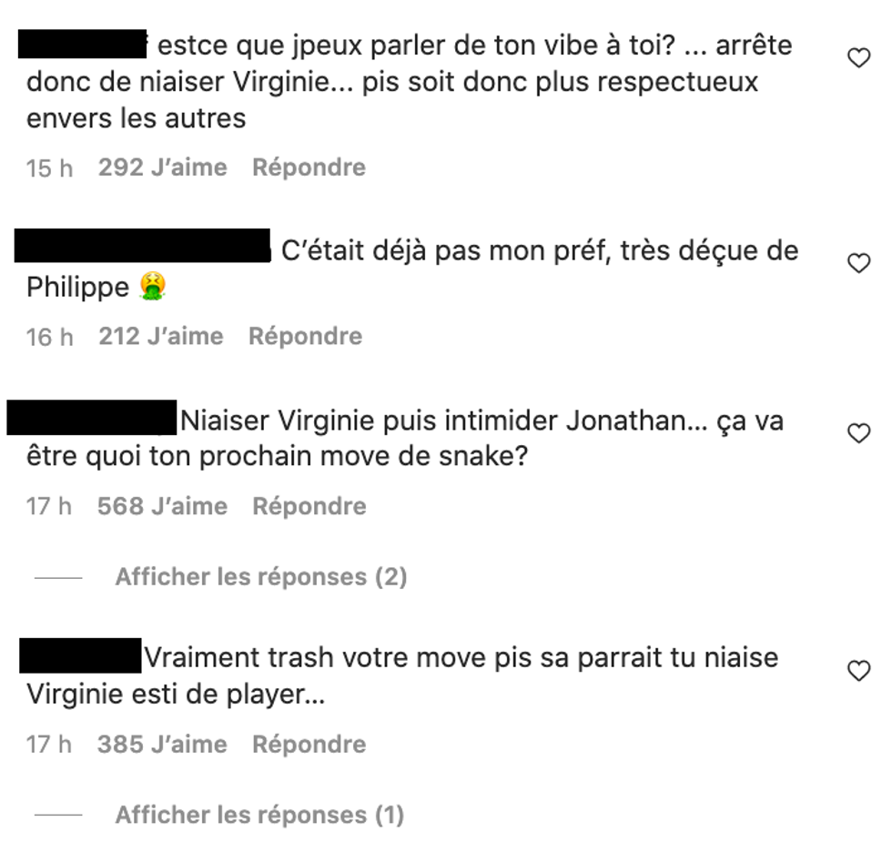 « Niaiser Virginie puis intimider Jonathan… ça va être quoi ton prochain move de snake? » a dit un internaute qui a reçu 568 mentions « j'aime ».