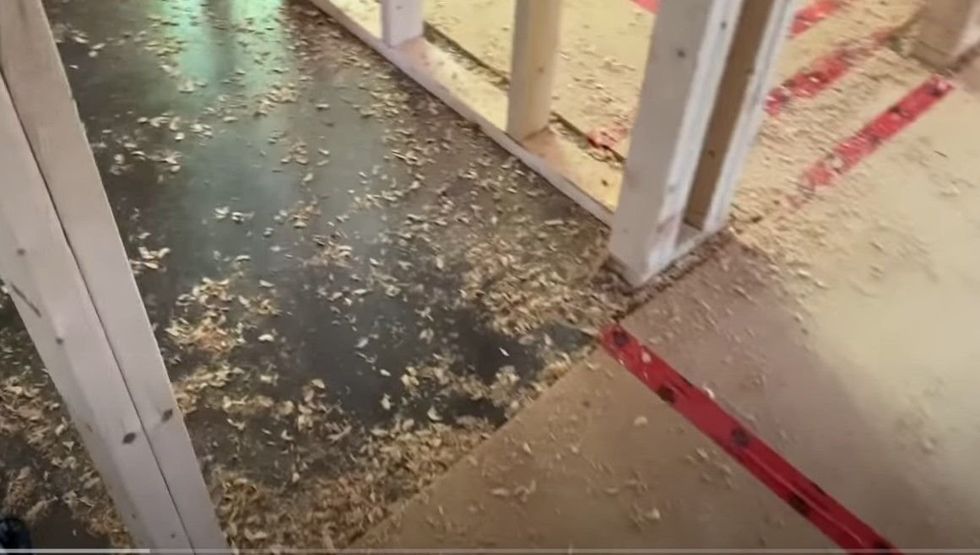 On peut voir que le matériau de béton noir est complètement recouvert de feuilles et de poussière. On remarque aussi que déjà, le plan initial change un peu alors que sur l'image qu'elle avait partagée à la base les planchers devaient être très pâles.