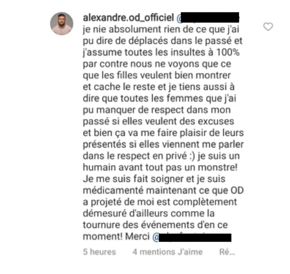 Alors que plusieurs personnes ont commenté cette publication en parlant des potentielles victimes et du comportement de l'ex-candidat de téléréalité, celui-ci a répondu à chacun.e d'elleux. Dans un message, il explique qu'il ne nie pas ses propos déplacés et qu'il assume avoir manqué de respect. Il continue en expliquant qu'il aimerait présenter ses excuses à celles auprès de qui il aurait eu un comportement problématique dans le respect, en privé :