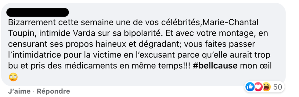 Certains ont également souligné le fait qu'ils ont diffusé un segment en lien avec Bell cause pour la cause, la journée annuelle de la compagnie pour parler de la santé mentale, alors que c'est la cause de la mésentente entre les deux rivales dans la maison.