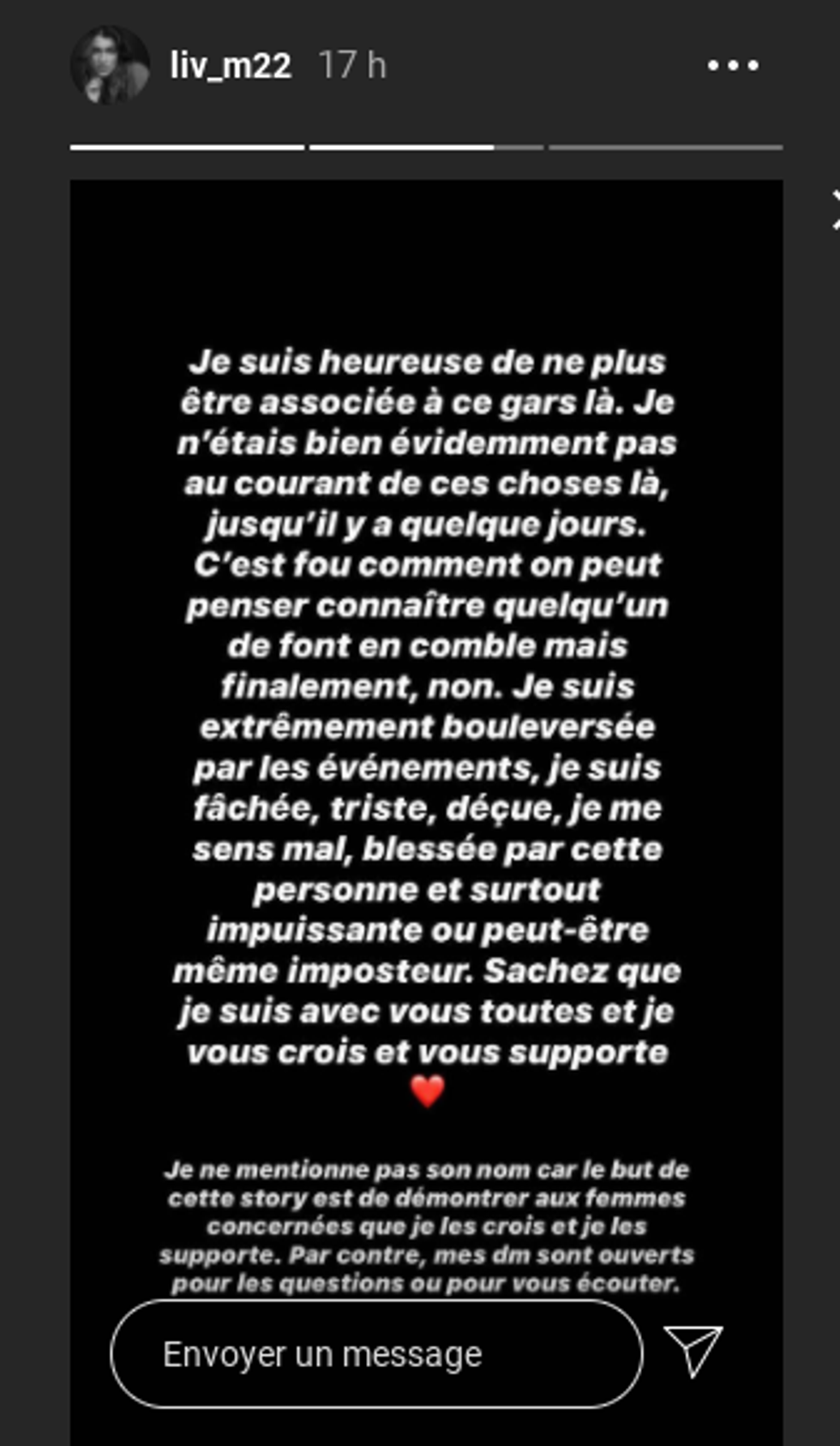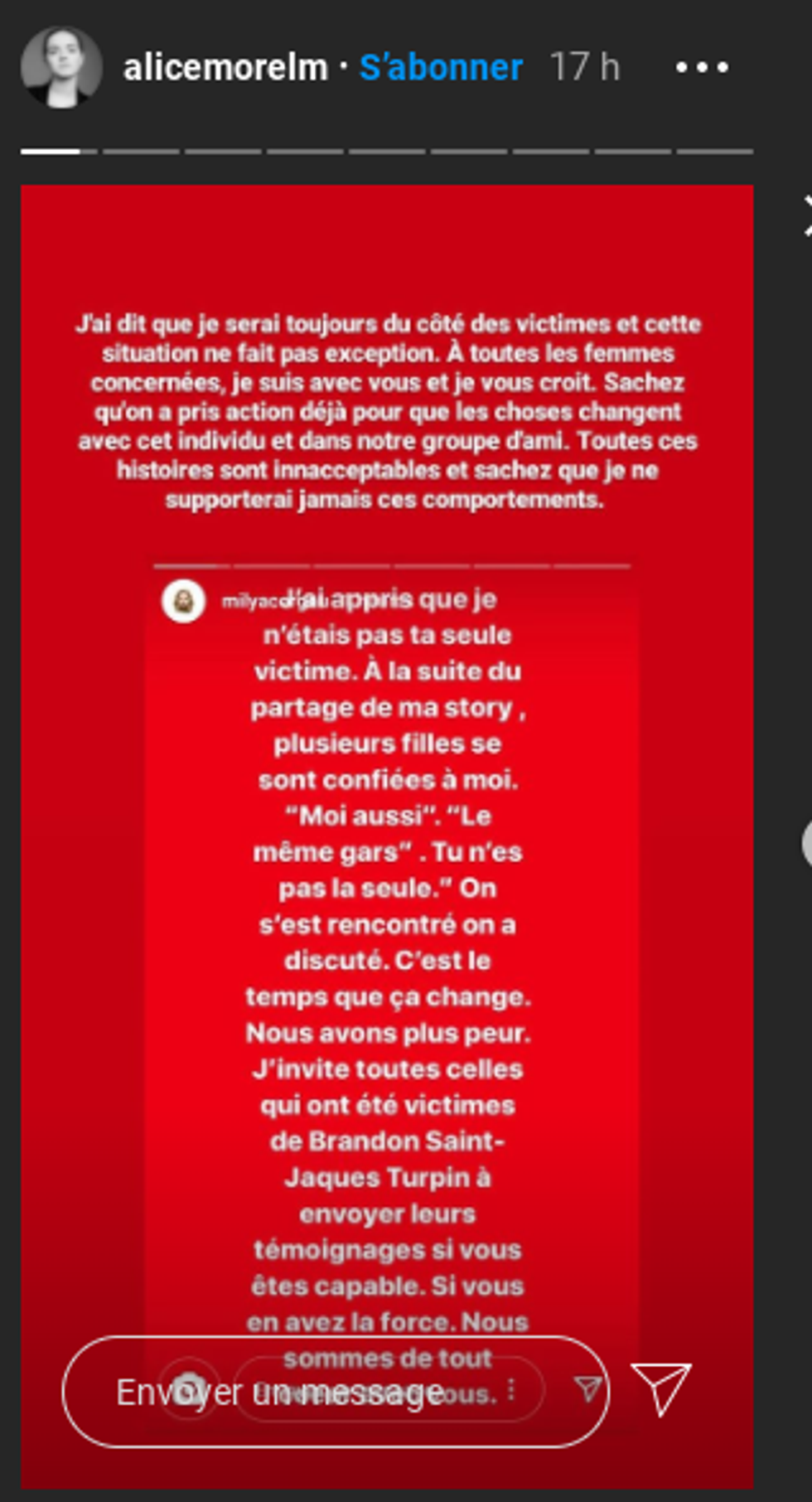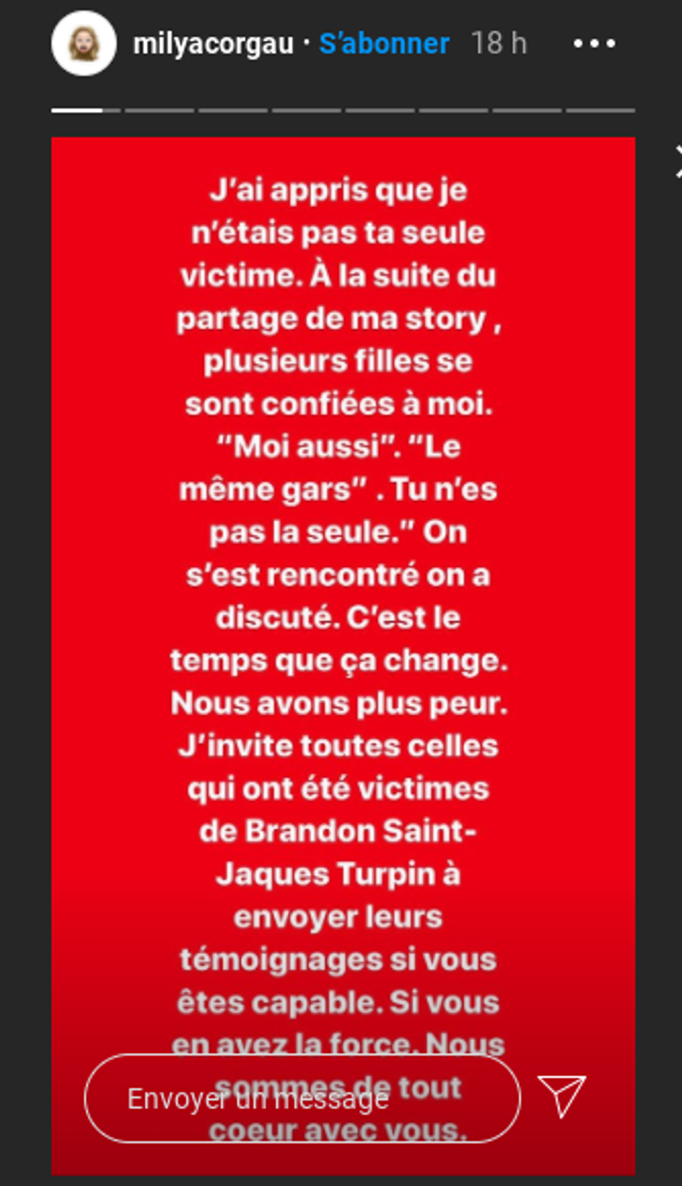 « À la suite du partage de ma story, plusieurs filles se sont confiées à moi. [...] J'invite toutes celles qui ont été victimes de Brandon St-Jacques Turpin à envoyer leurs témoignages si vous êtes capable », écrit-elle.