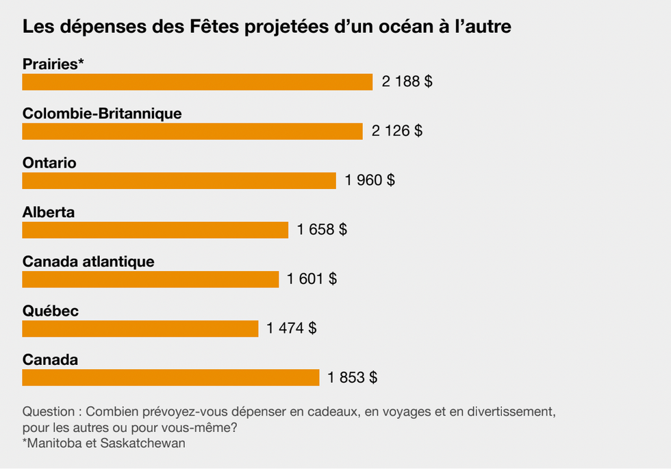 Les Québécois et Québécoises sont en voie d'être les plus économes à travers le pays pour cette période des Fêtes cette année, selon ce tableau de PwC Canada. En effet, ils et elles devraient dépenser en moyenne 1 474 $, soit près de 400 $ de moins que la moyenne nationale (1 853 $) et près de 500 $ en deçà de leurs voisins en Ontario (1 960 $). Cela dit, cette somme représente tout de même 'équivalent d'une paye bi-mensuelle... ou même plus!