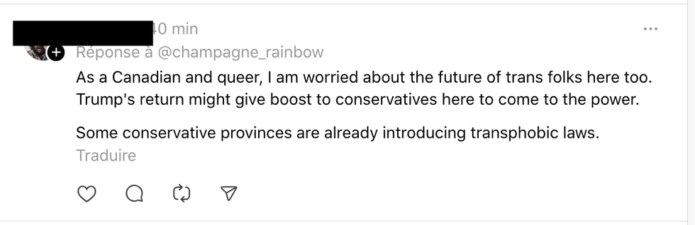« En tant que Canadien et queer, je suis inquiet pour l'avenir des personnes trans ici aussi. Le retour de Trump pourrait encourager les conservateurs à prendre le pouvoir. Certaines provinces conservatrices introduisent déjà des lois transphobes », a mentionné un usager de Threads.