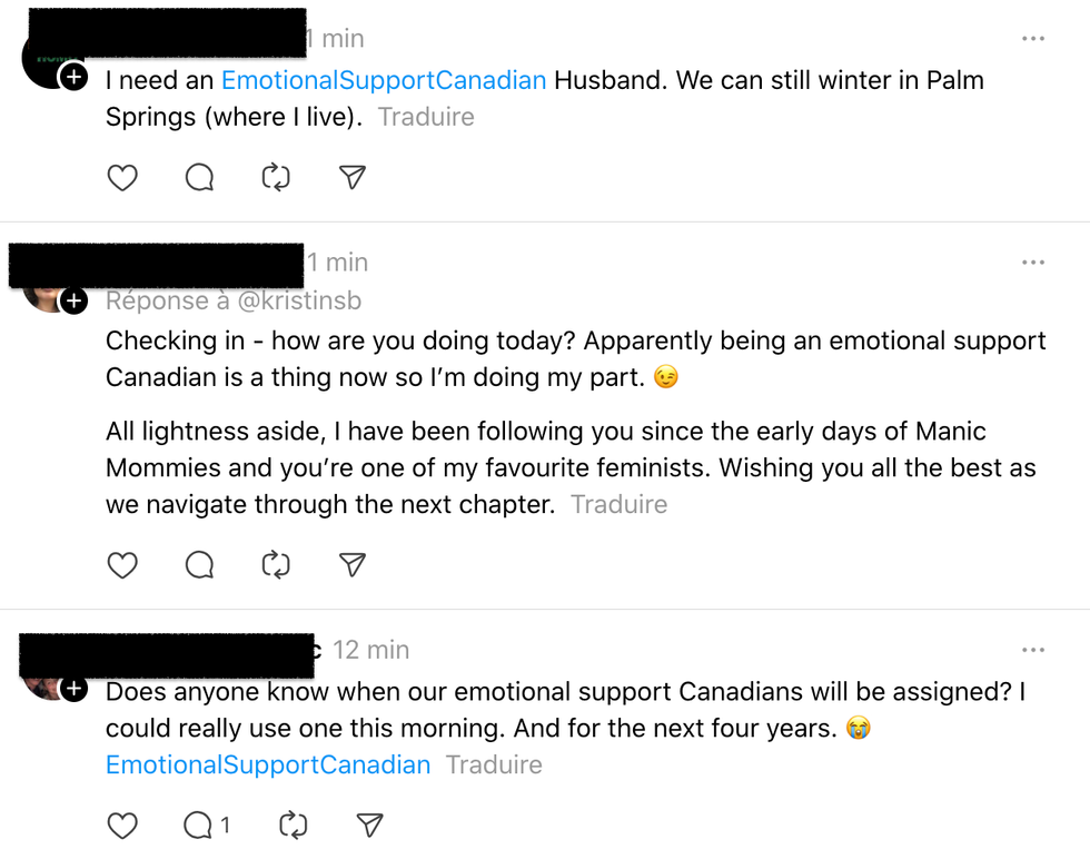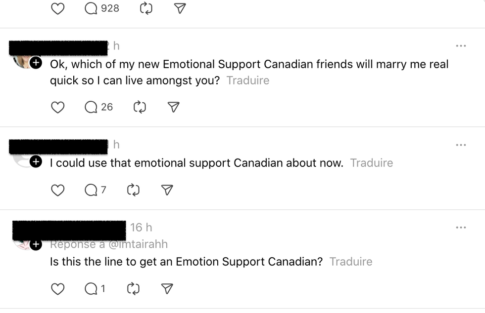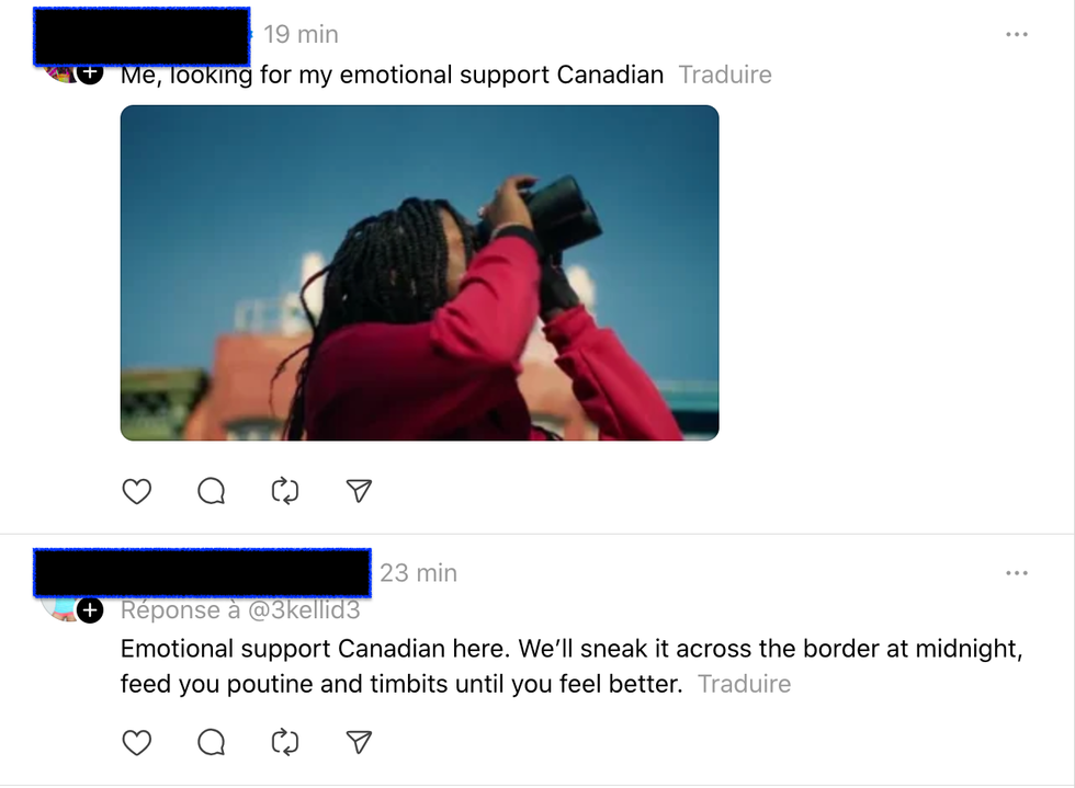 « Canadien de soutien émotionnel ici. On va se faufiler de l'autre côté de la frontière à minuit, vous nourrir de poutine et de Timbits jusqu'à ce que vous vous sentiez mieux », a écrit une personne.