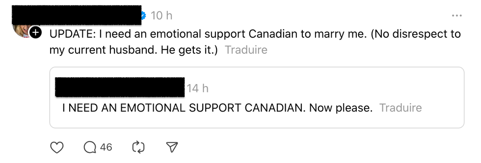 Certain.e.s sont même allé.e.s plus loin en sollicitant un mariage avec une personne du Canada. « OK, lequel de mes nouveaux amis canadiens de soutien émotionnel voudrait me marier rapidement pour que je puisse vivre parmi vous? », peut-on lire.
