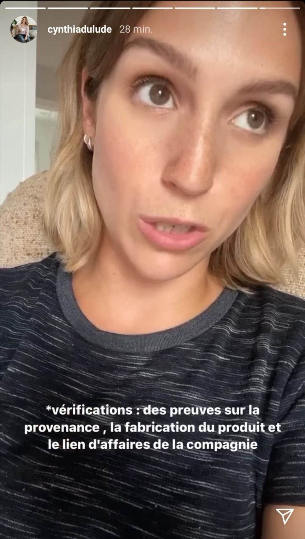 Cynthia Dulude, qui vit la même situation, encourage sa communauté à communiquer avec son agence pour répondre à toutes questions des personnes qui ont acheté le produit suite à ses stories :