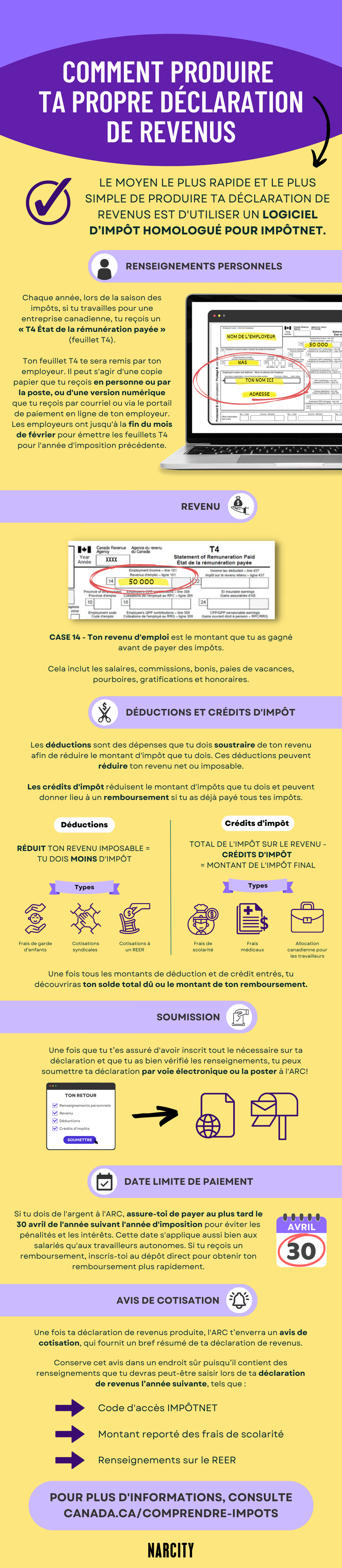 Pour en savoir plus sur la production de tes déclarations de revenus, rends-toi sur le site Web de l'Agence du revenu du Canada et suis-les sur Instagram, Twitter, Facebook ou YouTube.