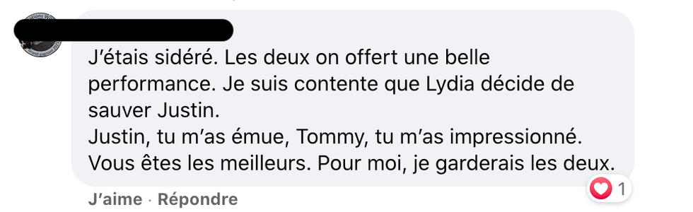 Après la performance, Jean-Marc Généreux a fait pencher son vote pour Tommy tandis que les Twins ont choisi de garder Justin dans l'aventure. Plusieurs téléspectateurs et téléspectatrices remercient Lydia d'avoir utilisé son sauvetage pour permettre aux deux d'atteindre la prochaine étape, soit celle de la révolution.