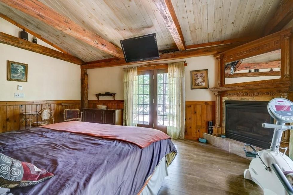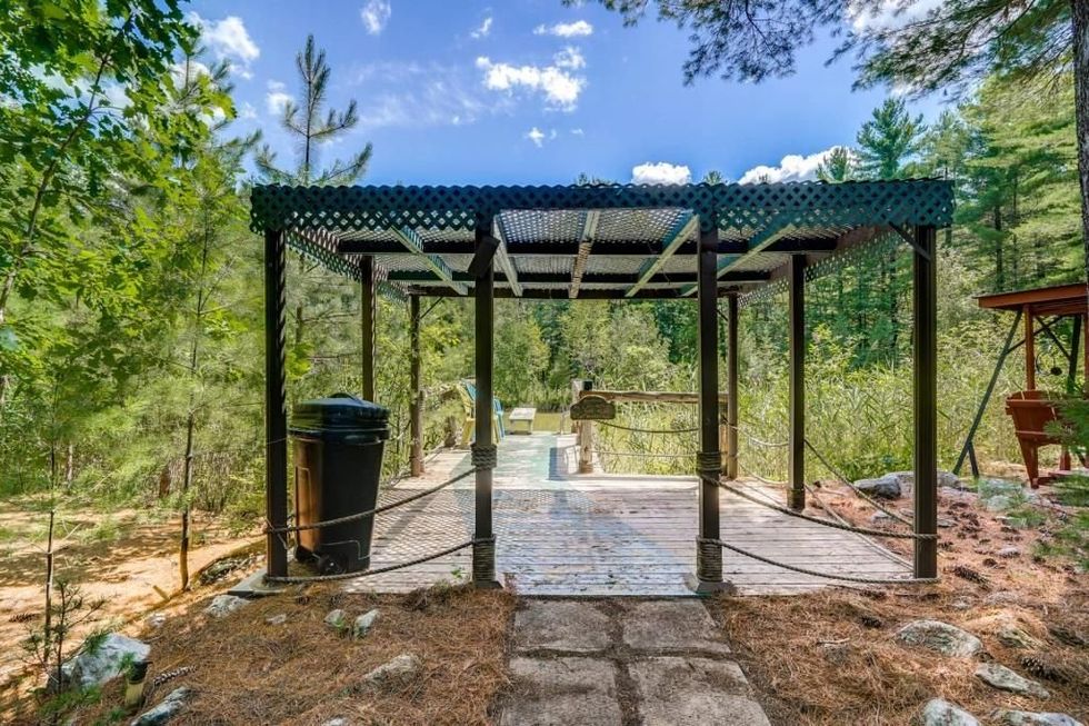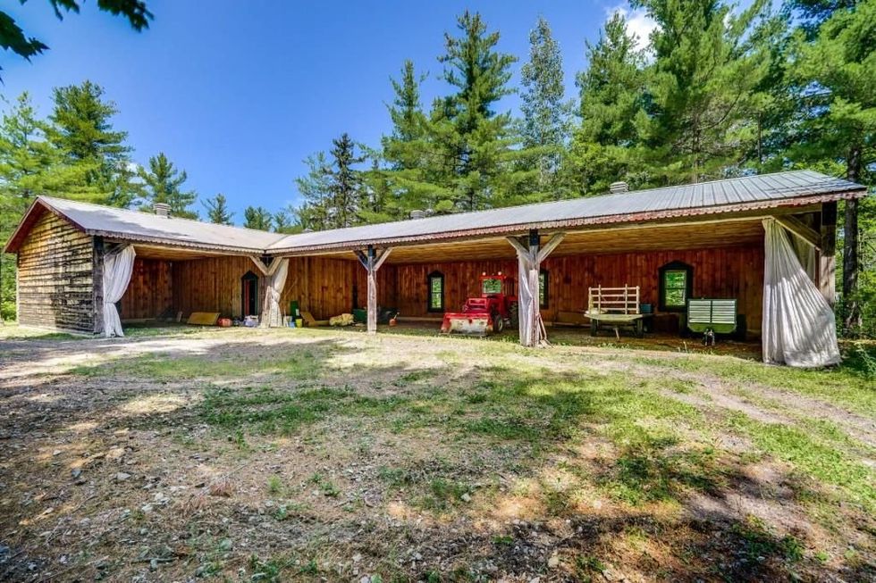 Il y a plusieurs espaces de rangement extérieur, comme des granges ou des garages, ainsi qu'une terrasse sur le bord d'un petit lac privé.