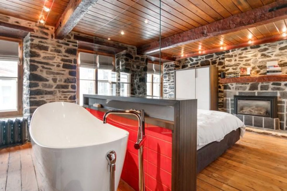L'ajout le plus moderne de la maison est définitivement la salle de bain, qui est littéralement au milieu de la chambre à coucher principale, juste derrière le lit. La douche et les comptoirs ont été complètement refaits, mais les poutres ainsi que la pierre préservent l'aspect ancestral.