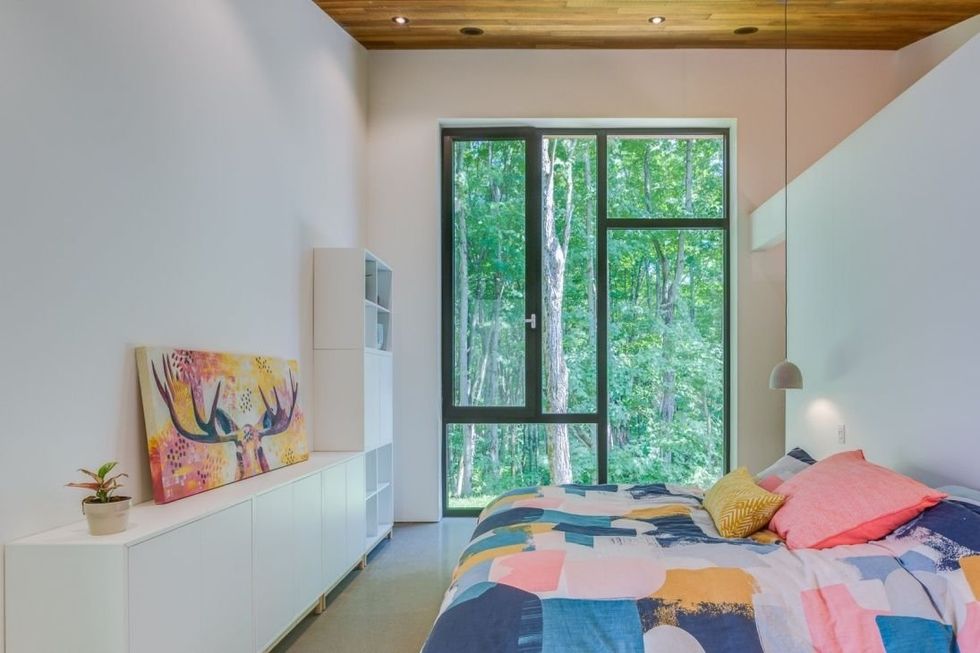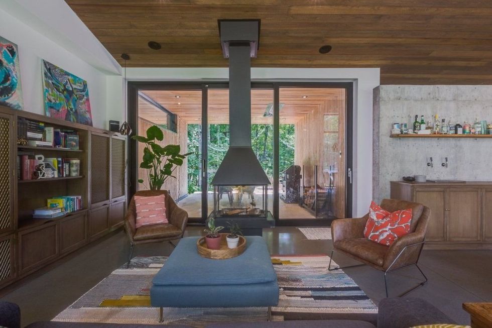 Plafonds en bois, mobilier moderne, matières organiques partout, touches de couleurs chaudes dans la déco : pas de doute, il s'agit bien de design californien. C'est ce qu'offre cette maison à vendre située dans les bois. En effet, son intérieur semble tout droit sorti d'un ranch de la Californie.