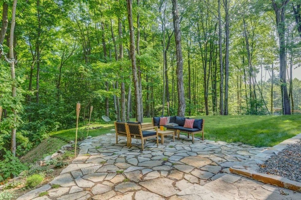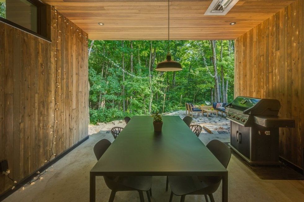 Cette maison en cèdre blanc profite de deux espaces extérieurs sur son immense terrain: un pour manger et un autre pour relaxer.