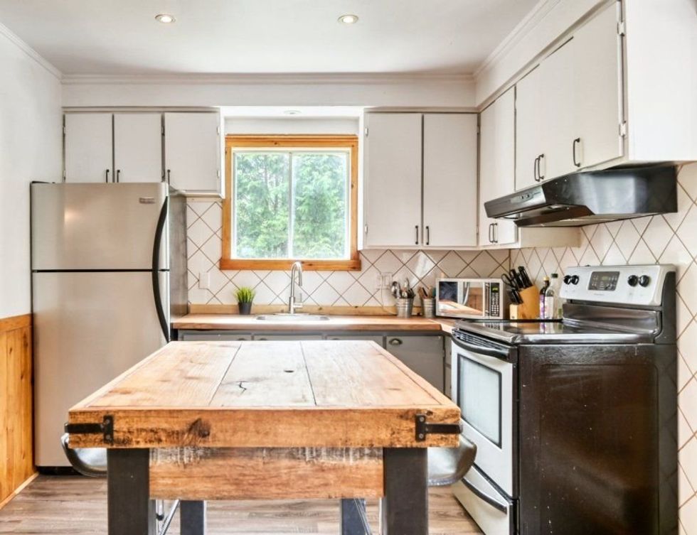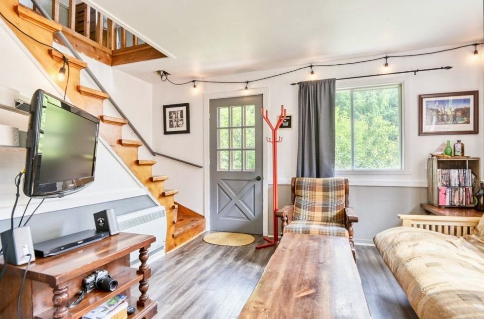 L'intérieur est tout aussi mignon, avec un petit salon qui a l'air plutôt confortable et une cuisine qui te donnera envie d'y rester l'hiver en préparant tes mets préférés.