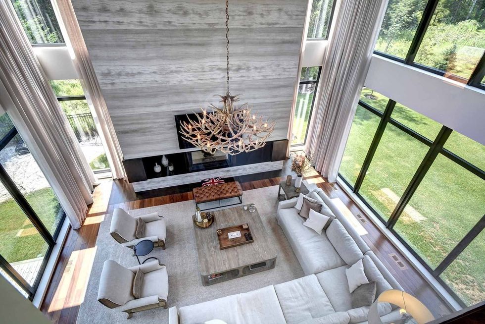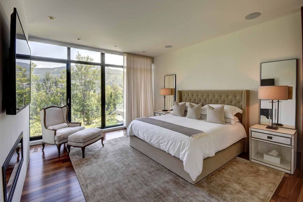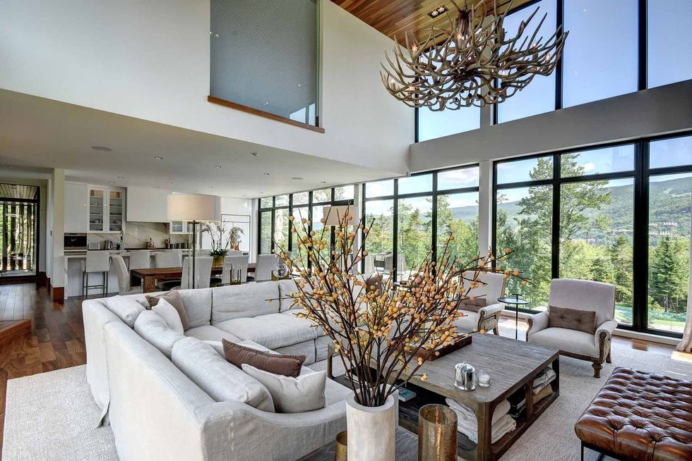 Le salon est complètement entouré de grandes fenêtres qui laissent entrer la lumière et offrent une vue unique sur les montagnes, dont le Mont-Tremblant.