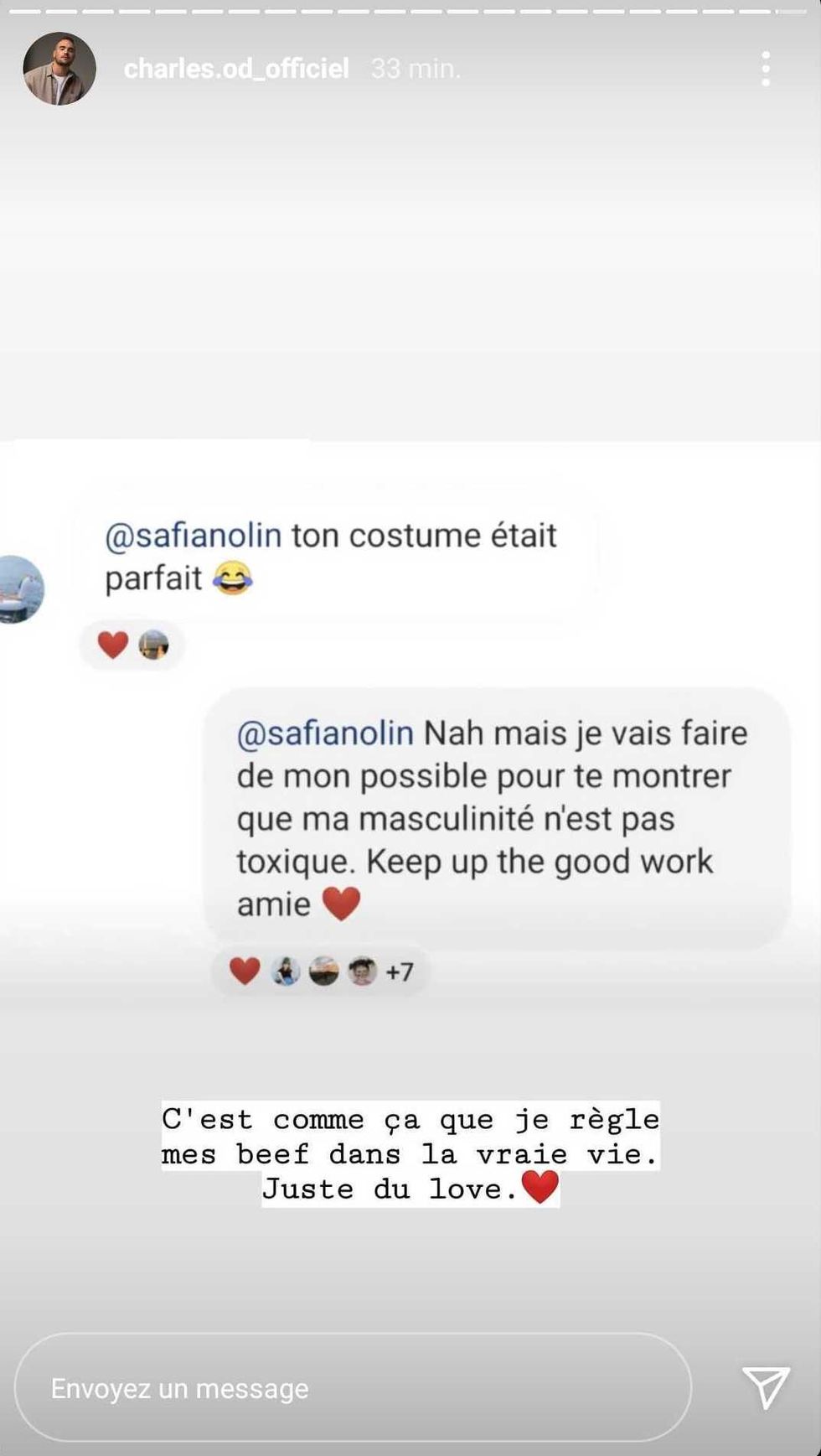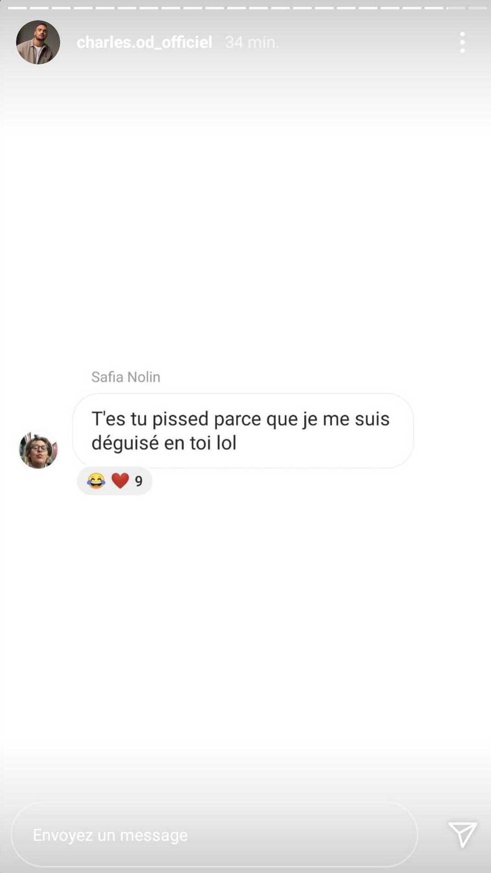 Dans une conversation privée de groupe, Safia Nolin s’est adressé à Charles quelques jours après sa sortie d'Occupation Double pour lui demander s’il était fâché qu’elle se soit déguisée en lui la semaine précédente.