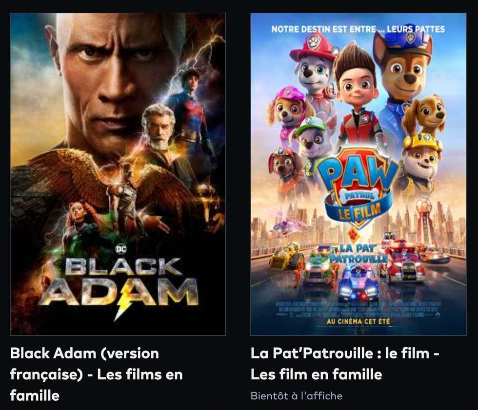 Cinéma Cineplex Odeon. Droite : Dwayne Johnson dans Black Adam.