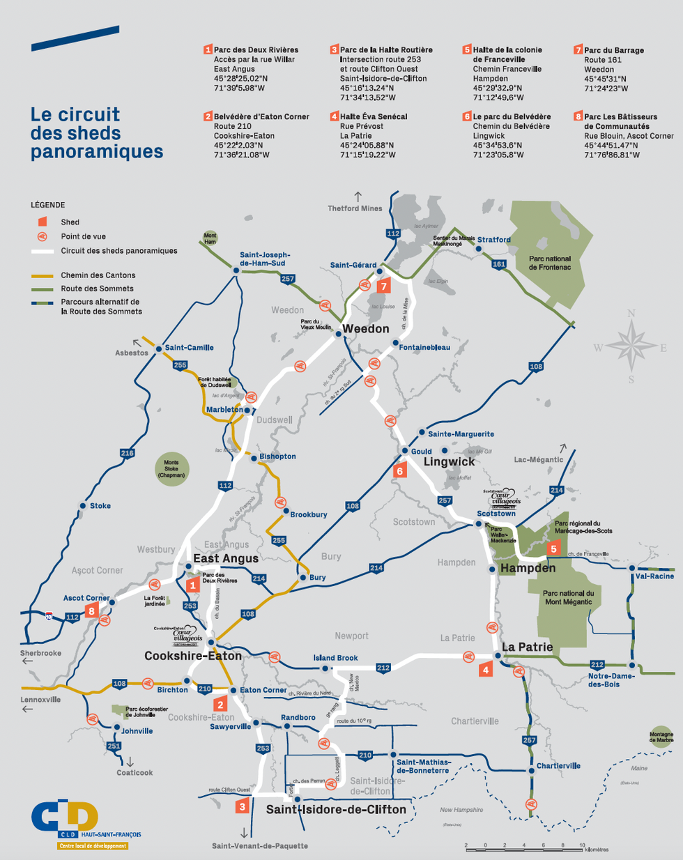 Le circuit se situe dans le Haut-Saint-François, à 2 h 15 de Montréal. Au total, il existe huit étapes. La première cabane se situe au niveau du Parc des Deux Rivières, dans la forêt avec une vue sur l'eau, la deuxième se trouve au belvédère d'Eaton-Corner avec une vue imprenable sur la montagne et la troisième est au parc de la Halte Routière à Saint-Isidore-de-Clifton.