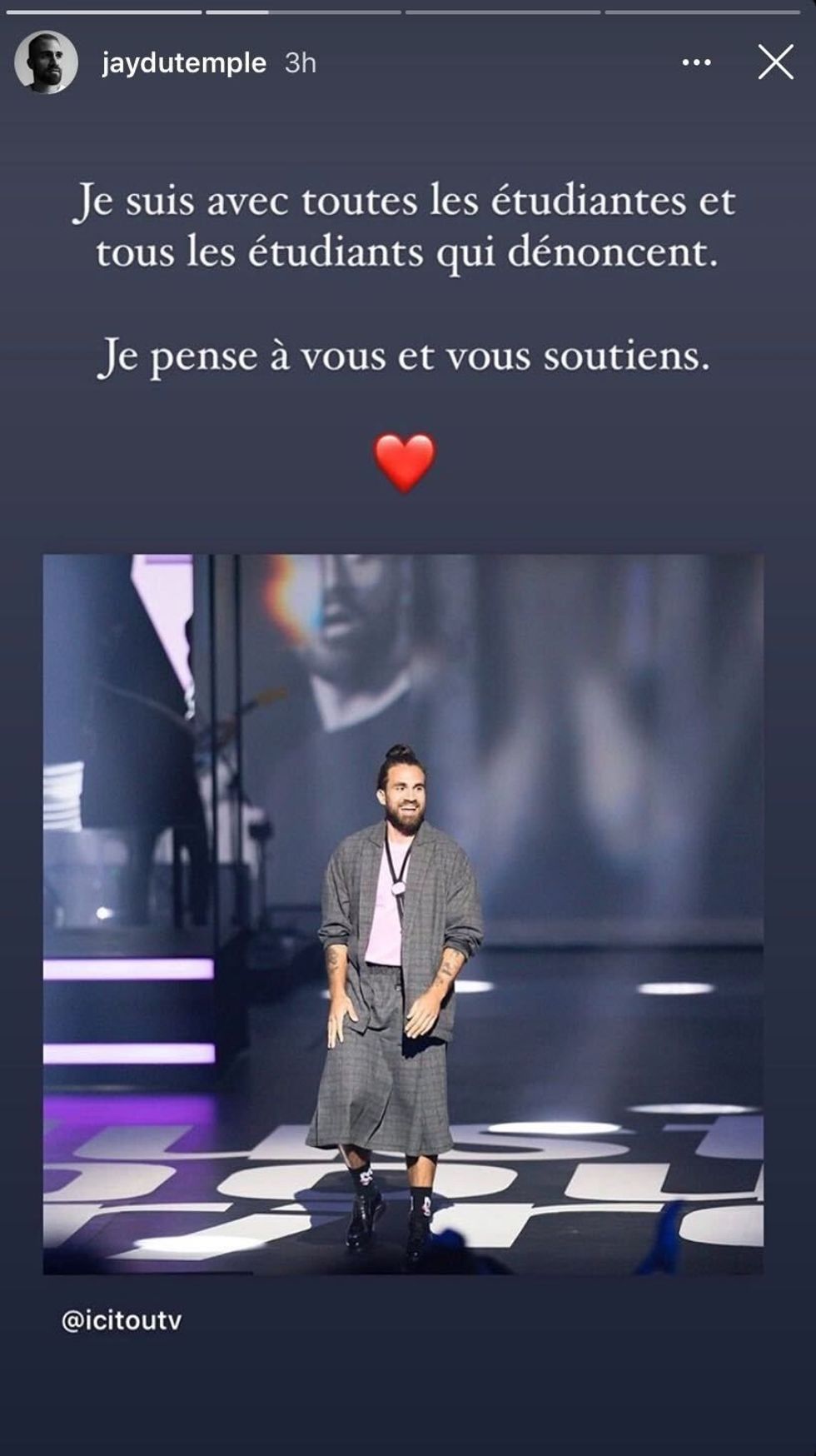 L'humoriste et animateur a fait une story Instagram le mercredi 14 octobre dans laquelle il démontre son soutient aux étudiants et se montre en jupe lors d'un spectacle Juste pour rire en janvier 2020.