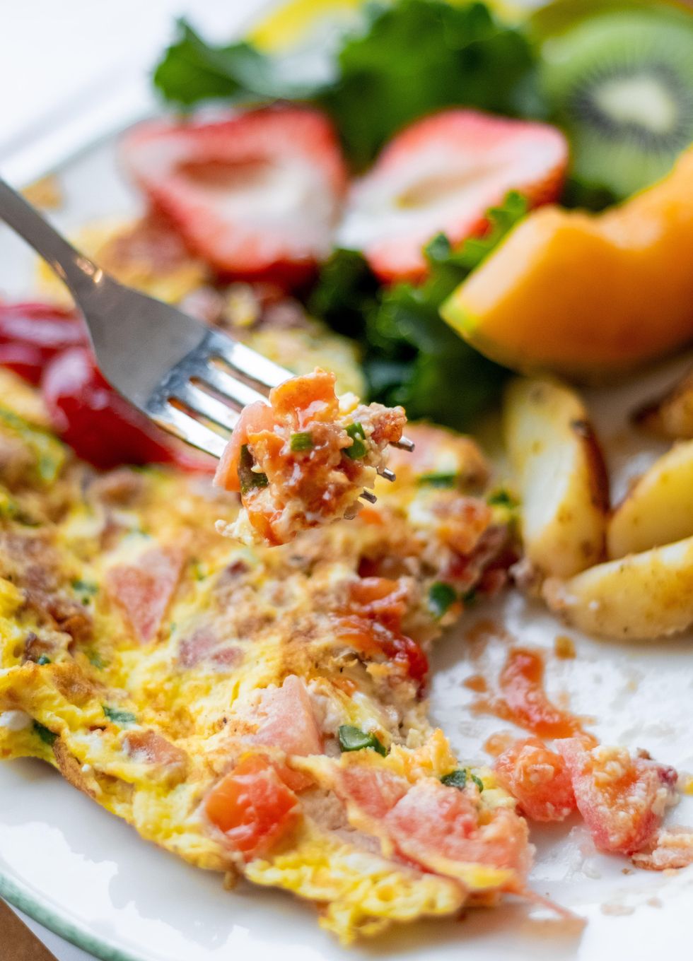 Les amateur.ices de bacon ne pourront résister à l'omelette Fromage de chèvre, bacon et tomates. Celle-ci comprend — tu l'auras deviné — du bacon, des tomates, du fromage de chèvre somptueux et des échalotes pour un petit éclat de fraîcheur. L'assiette est servie avec des rôties, des pommes de terre, ainsi qu'un choix de fruits frais ou de tomates.