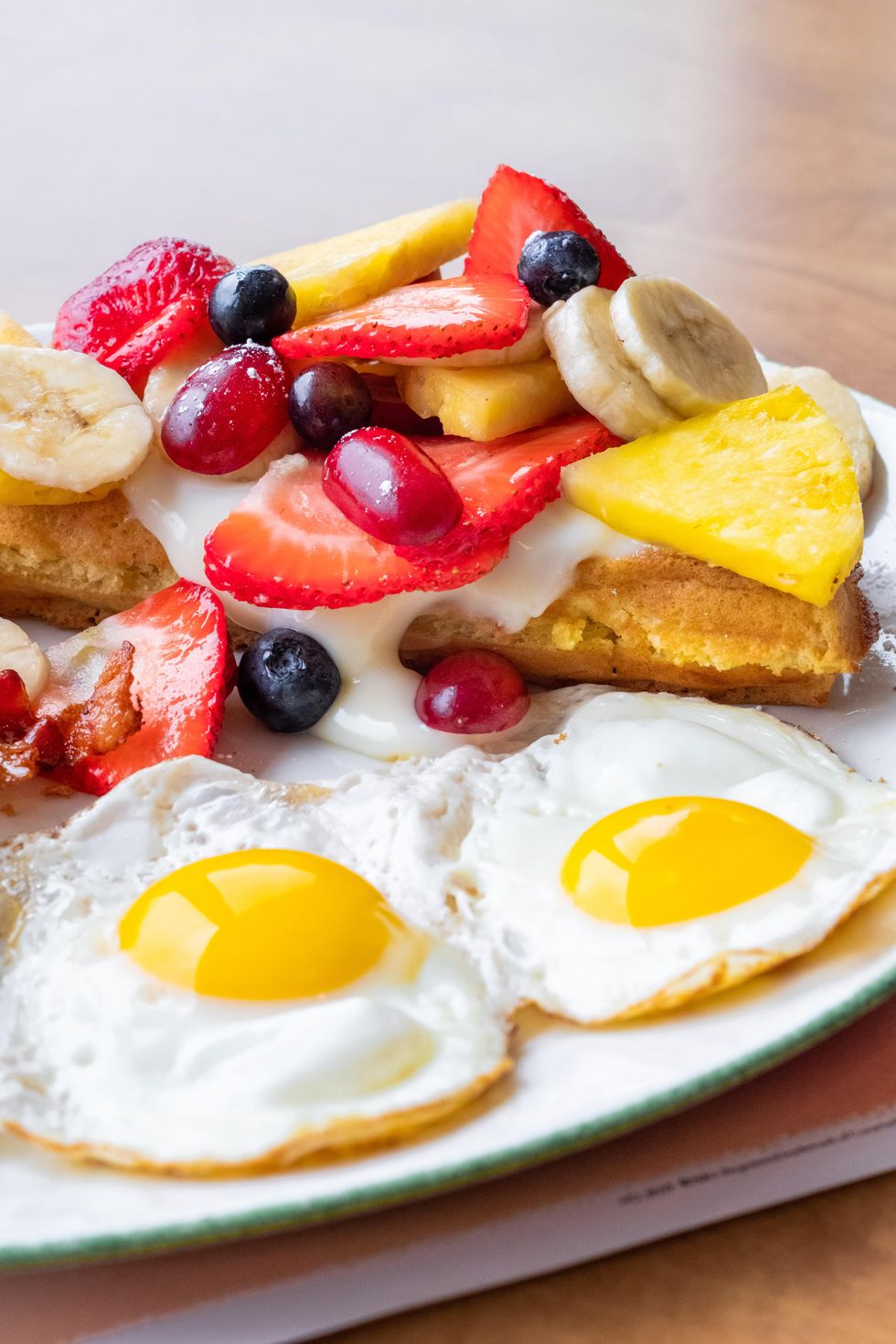 Pour sa part, le Tout inclus de Paul te propose la totale. Ce dernier comporte deux œufs cuits comme tu les aimes, du bacon et des pommes de terre. L'assiette est complétée par une demi-gaufre débordante de fruits frais et de crème pâtissière.