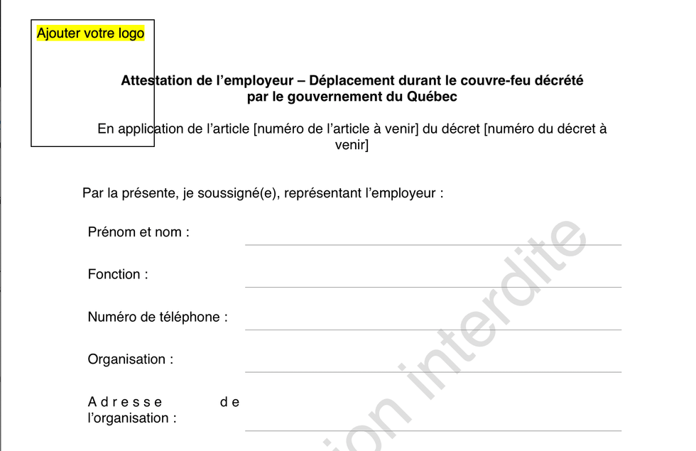 Sur son site Web, le gouvernement invite les employeurs « à télécharger, à remplir et à signer le formulaire Attestation de l’employeur – Déplacement durant le couvre-feu décrété par le gouvernement du Québec ».