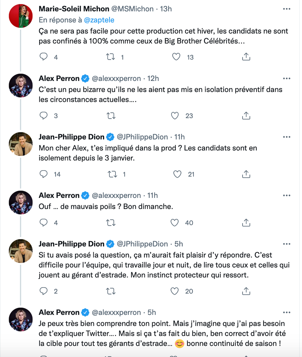 Après que le premier variété de Star Académie 2022, prévu pour le dimanche 16 janvier, ait été reporté en raison de cas de COVID-19, l'humoriste Alex Perron et l'un des producteurs de l'émission, Jean-Philippe Dion, ont eu un échange tendu sur Twitter concernant la quarantaine des participant.es de la saison.