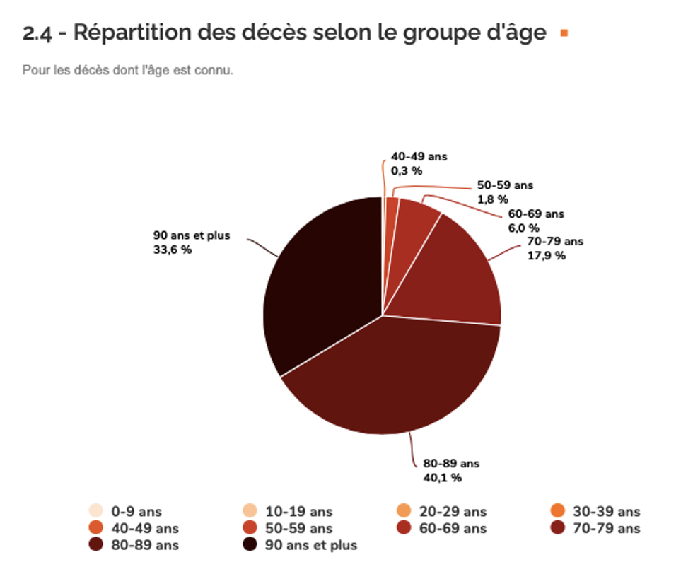 Depuis le début de la pandémie, 5 730 Québécois ont perdu la vie. Les 60 ans et plus totalisent 5 594 décès, soit plus de 97 % des morts déplorées.