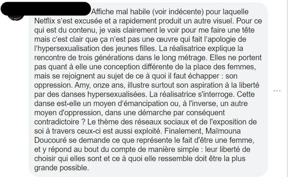 « Affiche mal habile (voir indécente) pour laquelle Netflix s’est excusée et a rapidement produit un autre visuel. […] Mais c’est clair que ça n’est pas une œuvre qui fait l’apologie de l’hypersexualisation des jeunes filles…
