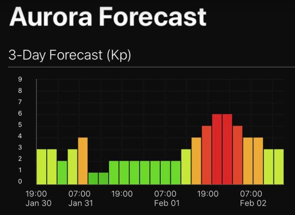 Selon les prévisions de l'application Aurora Forecast qui émet des prévisions astrales, les aurores boréales débuteront vers 19 h ce 1 février avec une probabilité à 5 Kp sur 10 ( Kp étant l'indice qui permet de calculer la gravité des perturbations magnétiques). Le phénomène s'intensifiera ensuite de 22 h à 1 h du matin à 6 Kp, puis il retrouvera sa forme initiale vers 4 h du matin ce 2 février.