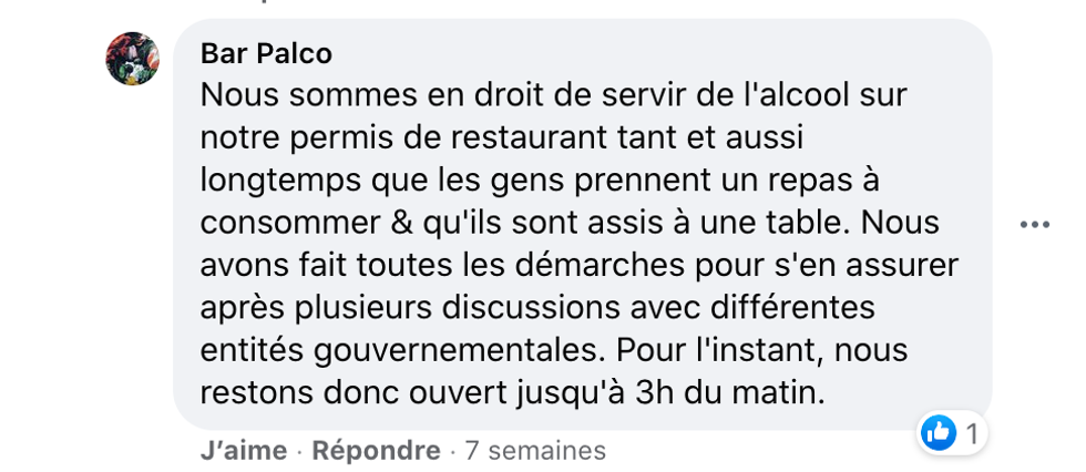 Le Bar Palco a précisé le tout sur sa page Facebook en indiquant: « Nous sommes en droit de servir de l'alcool sur notre permis de restaurant tant et aussi longtemps que les gens prennent un repas à consommer et qu'ils sont assis à une table. »