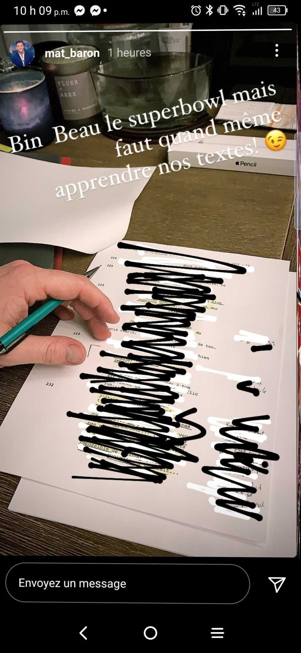 Le 7 février dernier, le comédien a partagé, en story Instagram, une photo de ses textes à apprendre pour District 31.