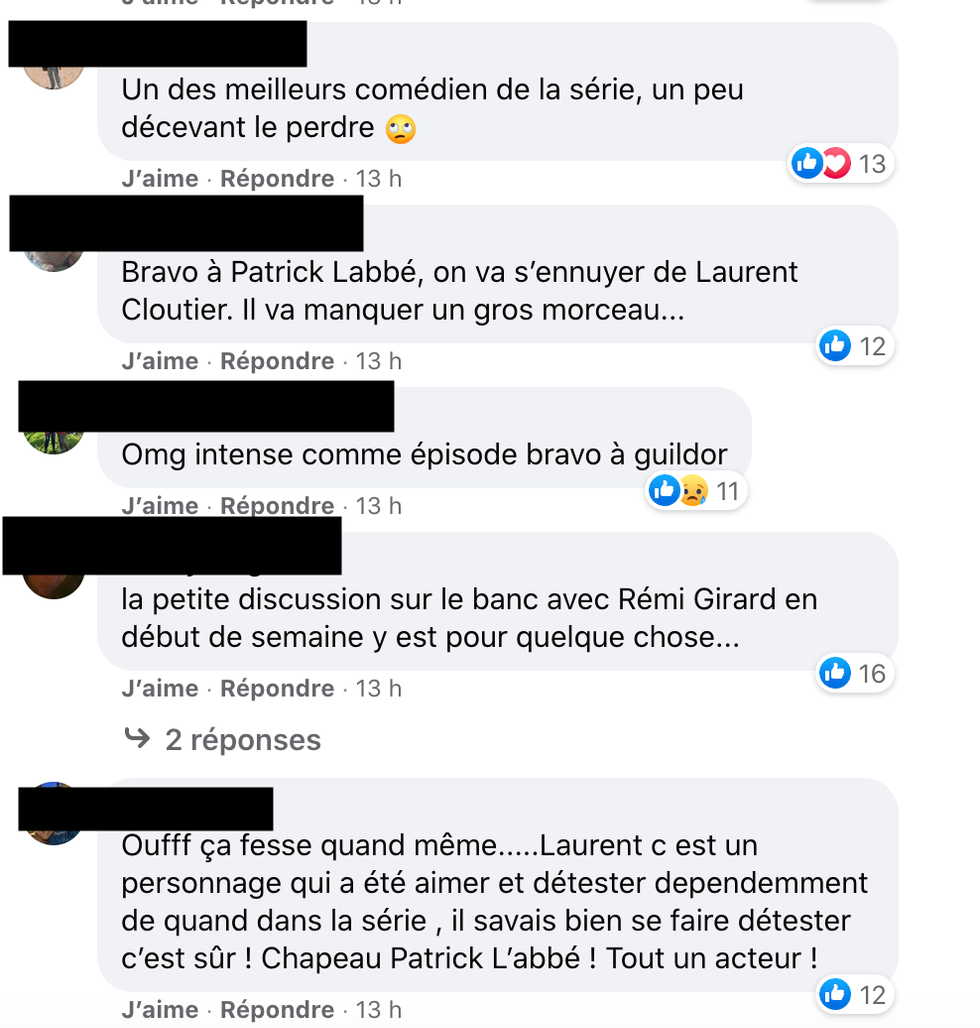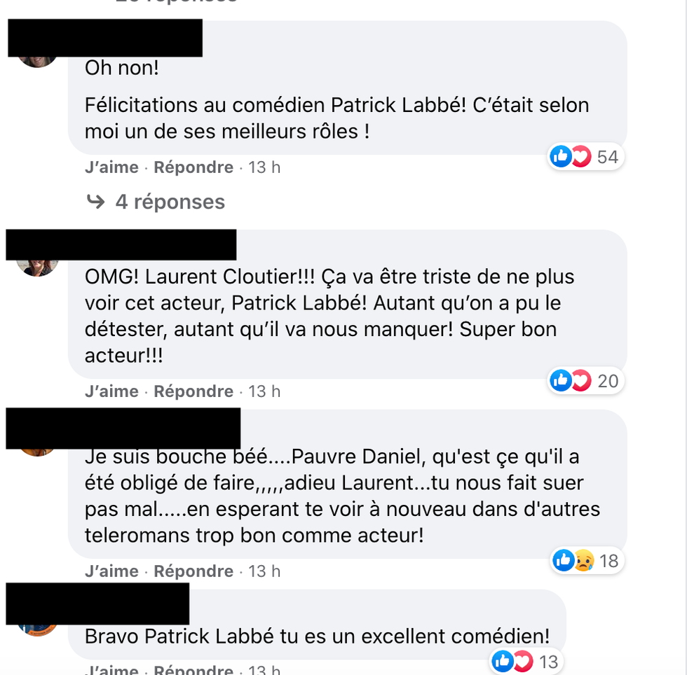 « Ça va être triste de ne plus voir cet acteur, Patrick Labbé! Autant qu'on a pu le détester, autant qu'il va nous manquer », a écrit cet internaute.