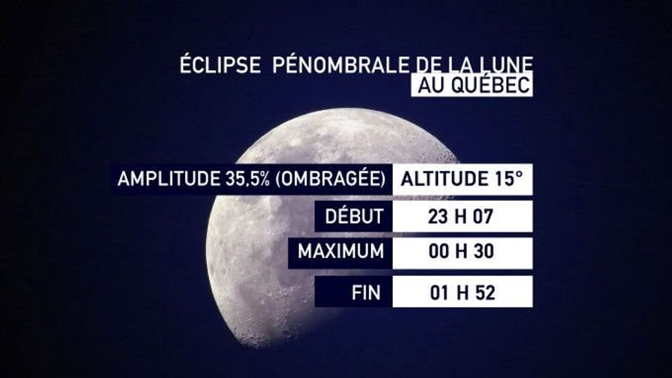 Selon Météomédia, l'événement débutera aux alentours de 23 h 07 et se terminera vers 1 h 52.