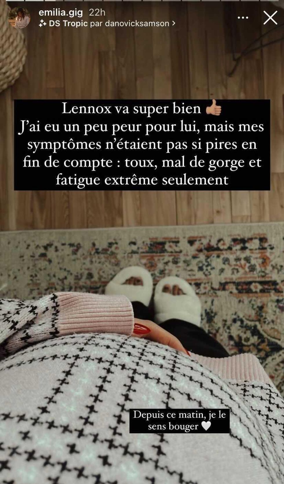 « Bébé Lennox, papa et maman se sont reposés à 110 % ces derniers jours. Lennox va super bien. J'ai eu un peu peur pour lui, mais mes symptômes n'étaient pas si pires en fin de compte : toux, mal de gorge et fatigue extrême seulement. Depuis ce matin, je le sens bouger. »