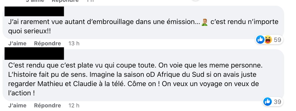 « C'est rendu que c'est plate vu qu'ils coupent tout. On voit que les mêmes personnes. L'histoire fait plus de sens. Imagine la saison OD Afrique du Sud si on avait juste regardé Mathieu et Claudie à la télé. Come on! On veut un voyage, on veut de l'action! »