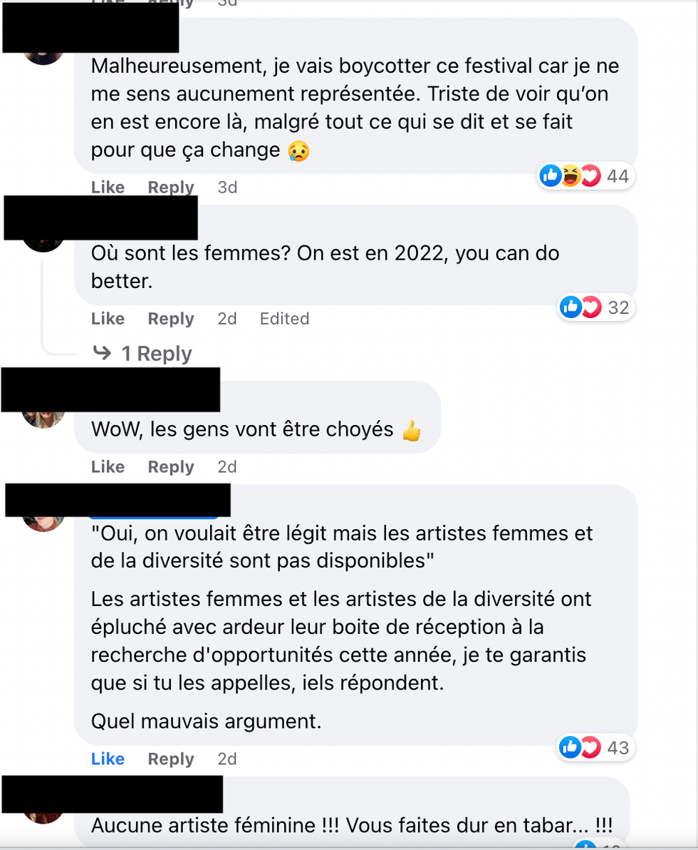 Sur l'affiche, on peut lire les noms de Fouki, Koriass, Clay and Friends et plusieurs autres artistes masculins. Ce manque de diversité n'a pas plu à plusieurs personnes et iels se sont exprimés parmi les quelque 836 commentaires sous l'annonce en date du 7 mars. Un.e abonné.es a même précisé que dans les années précédentes, il y avait soit aucune femme en tête d'affiche ou jamais plus que trois.