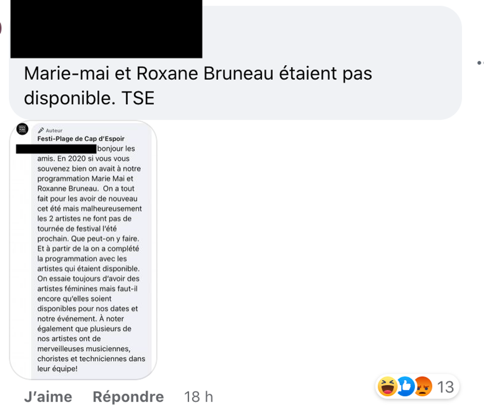 « ... nous sommes extrêmement désolés et peinés de toute la situation! En aucun cas, l’exclusion des artistes féminines dans la programmation du Festi-Plage n’a été volontaire, bien au contraire! »