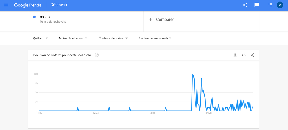 Sur GoogleTrends, on peut voir que le terme « mollo » a explosé dans les recherches au Québec dès 14 h 08, soit l'heure à laquelle le gouvernement a fait ses annonces. Ce sont les habitant.es de la ville de Sherbrooke, Québec, Gatineau, Laval, Montréal, Longueuil et Trois-Rivière qui auraient le plus tapé ce terme sur leur barre de recherche Google.