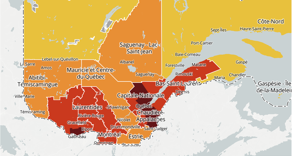Parmi les régions qui ne sont pas au rouge foncé, celles du Grand Montréal comptent le plus de cas actuellement.