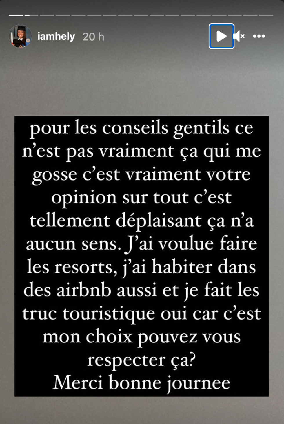Hélène finit sa série de stories en se demandant si c'est la jalousie le problème et en soulignant que depuis qu'elle est partie en voyage, elle reçoit encore plus de mauvais commentaires que d'habitude.