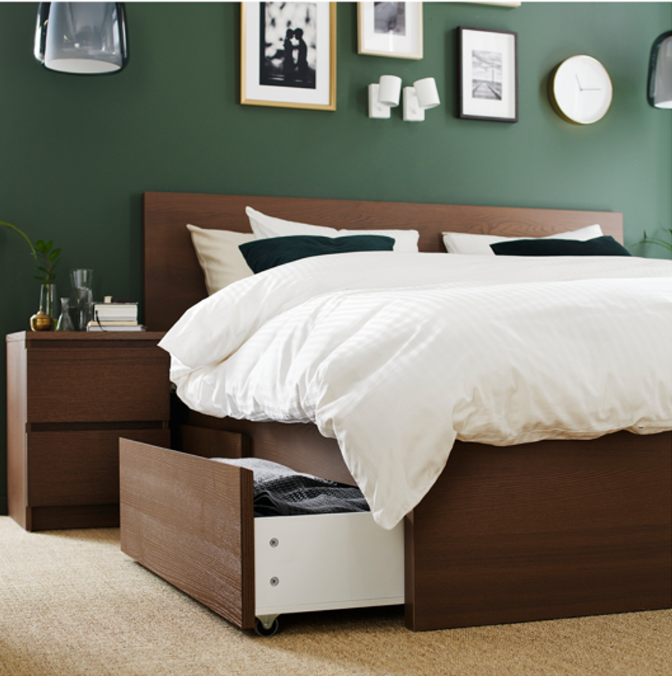 Détails : L'une des collections les plus populaires d'IKEA, MALM a mis à rabais ses bases de lit. Disponible en blanc, beige, brun et noir, avec deux ou quatre tiroirs.