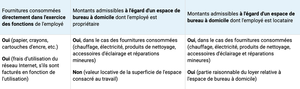 Si tu es locataires, ces mêmes dépenses le sont également, en plus d'« une partie raisonnable du loyer relative à l'espace de bureau à domicile ».