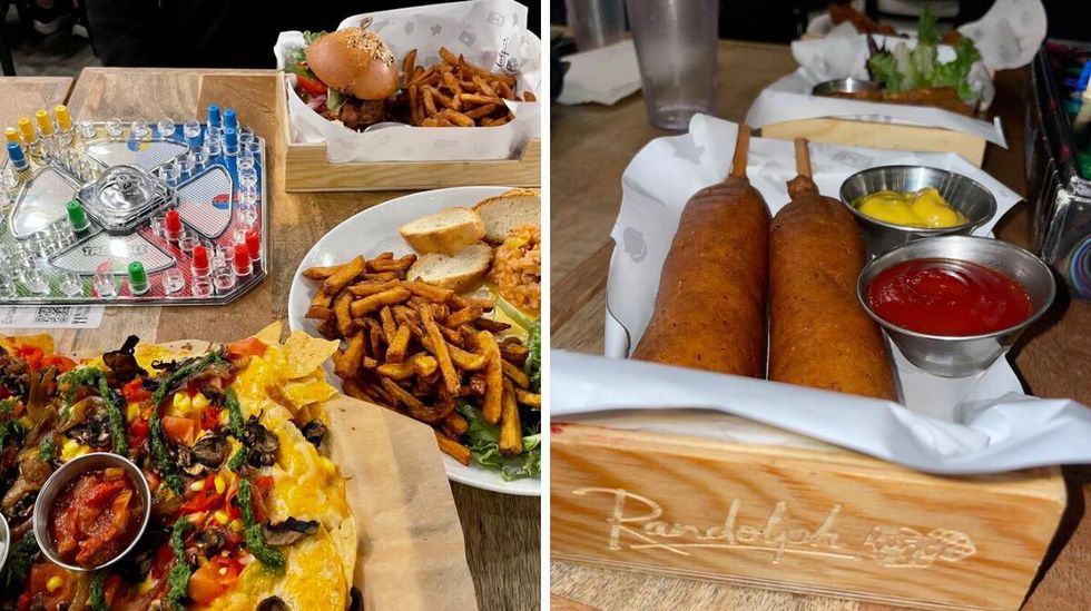 Entre-temps, nos plats et boissons arrivent. Burger de porc effiloché, nachos végétariens, tartare de saumon — la totale. J’ai également commandé des saucisses panées véganes sur bâtonnet et sincèrement, j’en rêve tous les soirs depuis.