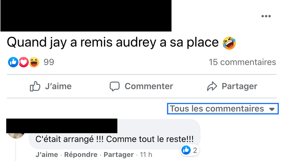 Ce à quoi Audrey a répondu que c'était possible. Sur Twitter et Facebook, les téléspectateurs.trices ne se sont pas gêné.es pour féliciter Jay d'avoir « remis Audrey à sa place », pour utiliser l'expression d'un.e internaute.